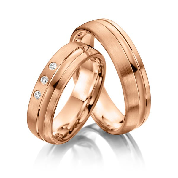 Jedes Paar dieser Trauringe ist mit drei funkelnden Steinbesatz von insgesamt 0,060 ct, tw, si verziert, der durch seine feine weiße Farbe und kleinen Einschlüsse einen Hauch von Luxus und Eleganz verleiht. Von romantischem Roségold bis hin zu klassischem Weißgold bieten wir eine breite Palette von Legierungen, um sicherzustellen, dass Ihre Trauringe perfekt zu Ihrem Stil und Ihrer Persönlichkeit passen.