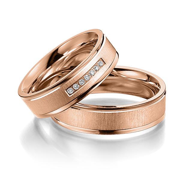 Jedes Paar dieser Trauringe ist mit drei funkelnden Steinbesatz von insgesamt 0,070 ct, tw, si verziert, der durch seine feine weiße Farbe und kleinen Einschlüsse einen Hauch von Luxus und Eleganz verleiht. Von romantischem Roségold bis hin zu klassischem Weißgold bieten wir eine breite Palette von Legierungen, um sicherzustellen, dass Ihre Trauringe perfekt zu Ihrem Stil und Ihrer Persönlichkeit passen.