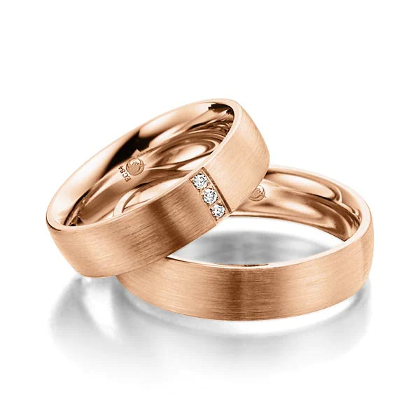 Das Profil der Ringe ist außen leicht abgerundet und innen stark gerundet (RL), was für einen außergewöhnlichen Tragekomfort sorgt. Die rotgoldene Farbe der Ringe strahlt Wärme und Romantik aus.
