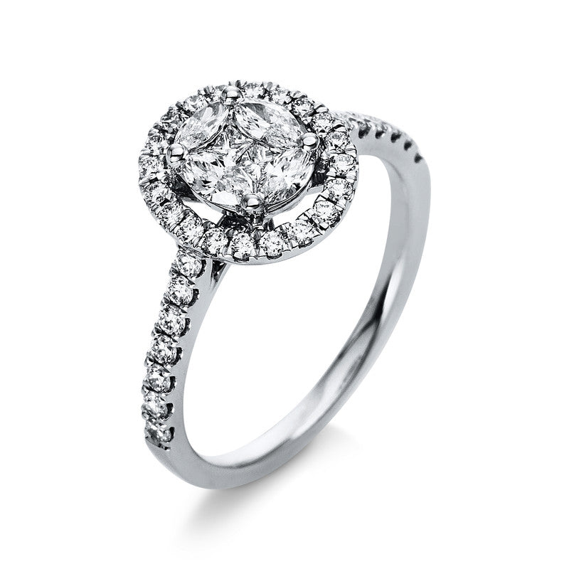 Ring 18 kt WG, 4 Navette 0.29 ct, TW-si, 2 Princ. 0.09 ct, TW-si, 34 brilliants 0.40 ct, TW-si, width: 54