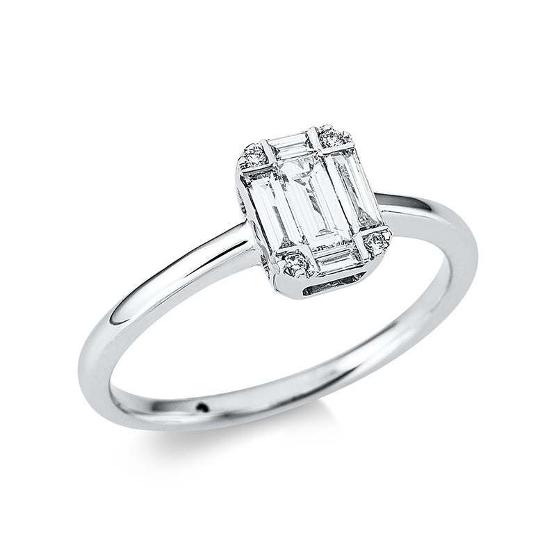 Ring 18 kt WG, 5 Baguette 0,34 ct, TW-si, 4 Brillanten 0,02 ct, TW-si, H:7,5 mm, Weite:54