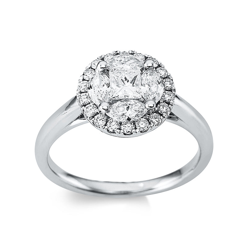 Ring 18 kt WG, 18 Brillanten 0,25 ct, TW-si, 4 Navette 0,52 ct, TW-si, 1 Princ. 0,23 ct, TW-si, Ø:10,6 mm, Weite:54