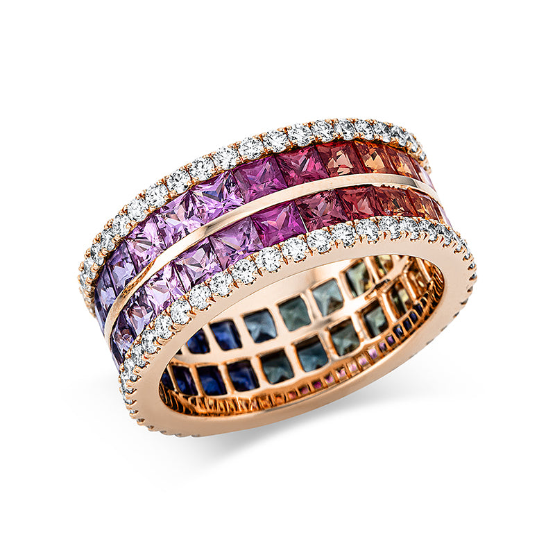 Ring 18 kt RG, 88 Brillanten 1,10 ct, TW-vsi, 50 Saphire 5,32 ct fancy, Weite:53