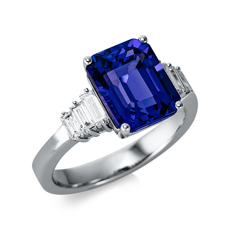 Ring 4er-Krappe 18 kt WG, 6 Baguette 0,37 ct, TW-si, 1 Tansanit 4,38 ct blau, H:15,6 mm, B:10,3 mm, S:7,0 mm, Weite:54