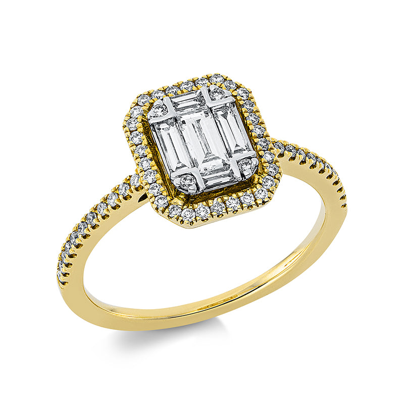 Ring 18 kt GG+WG, 5 Baguette 0,33 ct, TW-si, 56 Brillanten 0,23 ct, TW-si, H:9,0 mm, B:10,8 mm, Weite:54