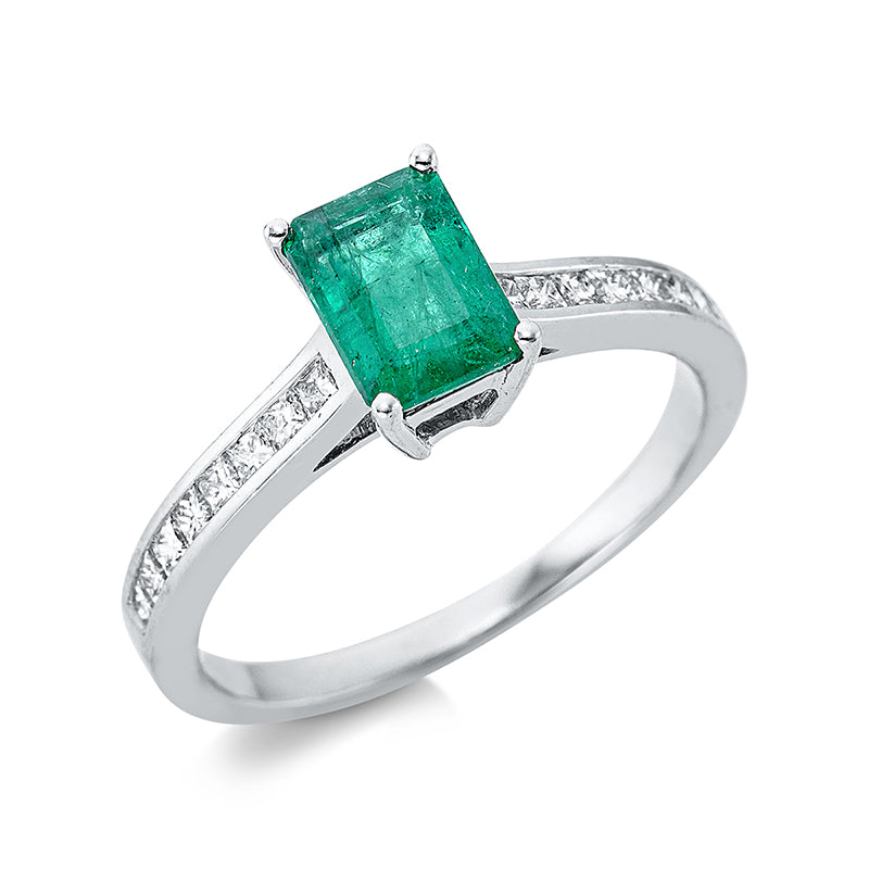 Ring 4er-Krappe 18 kt WG, 16 Princ. 0,32 ct, TW-si, 1 Smaragd 1,00 ct grün, H:5,4 mm, B:7,4 mm, Weite:54