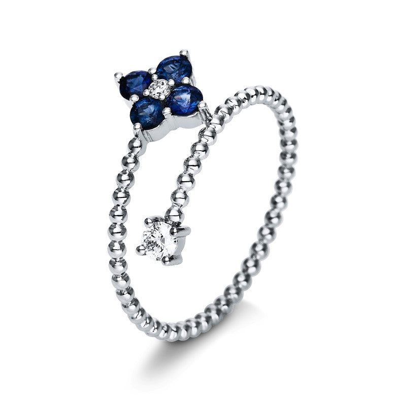 Ring 18 kt WG, 2 Brillanten 0,09 ct, TW-si, 4 Saphire 0,37 ct blau, Weite:54