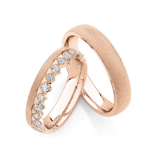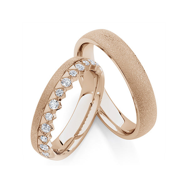 Jedes Paar dieser Trauringe ist mit drei funkelnden Steinbesatz von insgesamt 0,285 ct, tw, si verziert, der durch seine feine weiße Farbe und kleinen Einschlüsse einen Hauch von Luxus und Eleganz verleiht. Von romantischem Roségold bis hin zu klassischem Weißgold bieten wir eine breite Palette von Legierungen, um sicherzustellen, dass Ihre Trauringe perfekt zu Ihrem Stil und Ihrer Persönlichkeit passen.