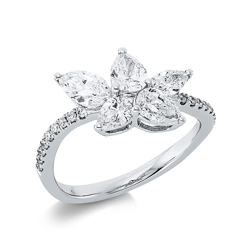 Кольцо 18 карат WG, 3 капли 0,84 карата, TW-si, 2 наветта 0,49 карата, TW-si, 18 бриллиантов классической огранки 0,13 карата, TW-si, высота: 15,1 мм, ширина: 9,2 мм, ширина: 54
