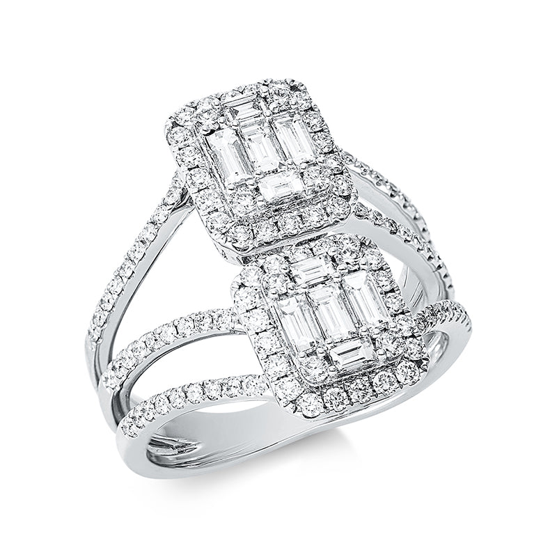 Кольцо 18 карат WG, 101 бриллиант 0,71 карат, TW-si, 10 багетов 0,57 карат, TW-si, ширина: 55