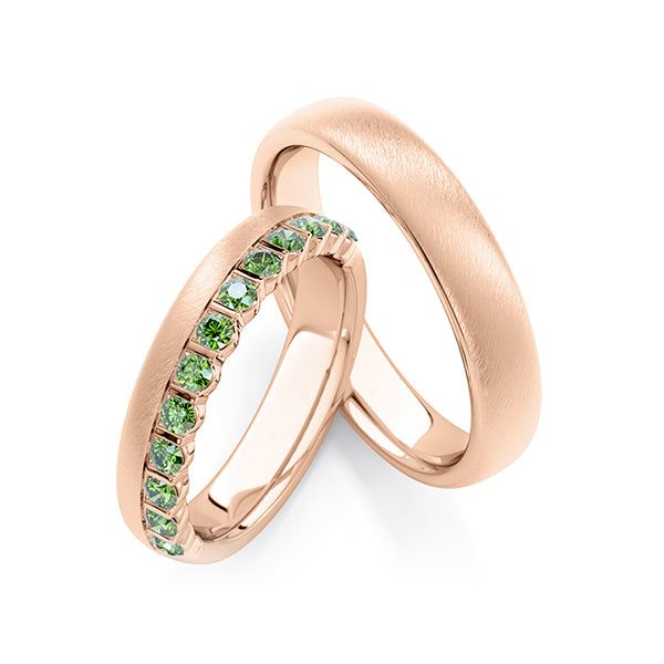 Jedes Paar dieser Trauringe ist mit drei funkelnden Steinbesatz von insgesamt 0,56 ct, tw, si verziert, der durch seine feine weiße Farbe und kleinen Einschlüsse einen Hauch von Luxus und Eleganz verleiht. Von romantischem Roségold bis hin zu klassischem Weißgold bieten wir eine breite Palette von Legierungen, um sicherzustellen, dass Ihre Trauringe perfekt zu Ihrem Stil und Ihrer Persönlichkeit passen.